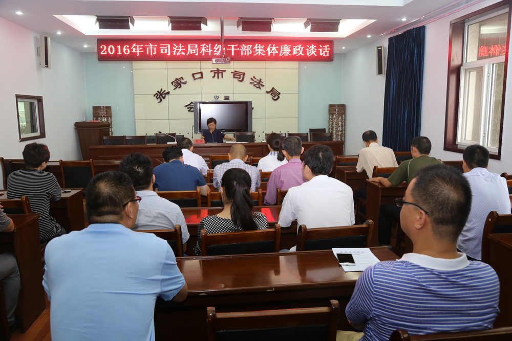 日前,张家口市司法局召开中层干部会,宣布了全局中层干部调整任命决定。会后,局党组成员、纪检组长沈牮对全局新提拔的干部和局所有处室、直属单位主要负责人共计35名进行了集体廉政谈话。警示该局中层领导干部要守住心里的防线,抵抗住外界的诱惑做一个政治上靠得住、工作上有本事、作风上过得硬、人民群众信得过的司法行政干部。