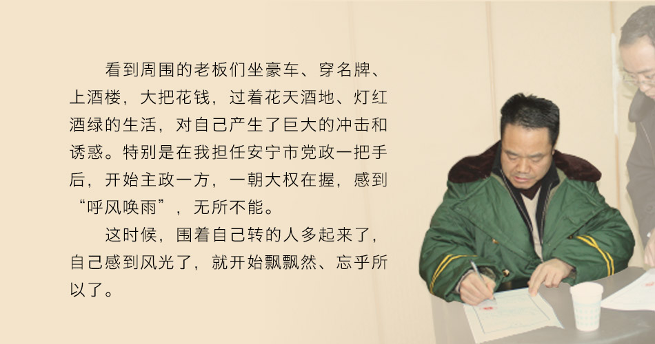 随着任职时间的增长、职务的升迁和环境的影响,我不自觉地放松了对自己的要求,放松了世界观、人生观的改造。看到周围的老板们坐豪车、穿名牌、上酒楼,大把花钱,过着花天酒地、灯红酒绿的生活,对自己产生了巨大的冲击和诱惑。特别是在我担任安宁市党政一把手后,开始主政一方,一朝大权在握,感到“呼风唤雨”,无所不能。